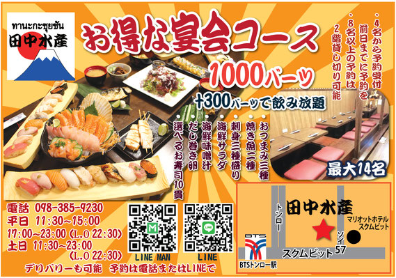 新鮮な魚を使った寿司や刺身をお得に楽しめる「田中水産」。トンロー店の場所は、スクムビット・ソイ57のマリオットホテル・スクムビット向かいにあります。こだわりのお寿司や刺身をお得に楽しめる「宴会コース」は、刺身3種盛りや焼き魚2種などのメニューが7種類あり、その中には、選べるお寿司10貫もあります。そのコースがなんと1000バーツで、プラス300バーツで飲み放題付きにできるので大変お得です。宴会コースは4名から予約可能で、前日までに要予約。同店1階は4人席のボックス席が4席と、1人でも気軽に入れるカウンター席があります。2階は最大14人座れる掘りごたつの部屋があり、8人以上からの予約で、2階が貸し切り可能です。新店舗でプラカノン店がオープン!また、バンナー店にも店舗があります。